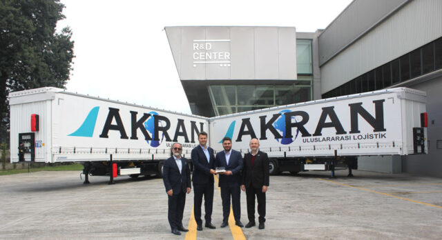 Akran Lojistik, yeni araçlarını Tırsan’ın Adapazarı’nda bulunan Mega Üretim Kampüsü’nde gerçekleştirilen tören ile teslim aldı. Törene Akran Şirketler Grubu Yönetim Kurulu Üyesi Efe Korkmaz, Akran Şirketler Grubu İcra Kurulu Başkanı Ahmet Uğur, Koçaslanlar Grubu Yönetim Kurulu Üyesi Muhsin Koçaslan ve Tırsan Treyler Satış İcra Kurulu Başkanı Ertuğrul Erkoç katıldı.