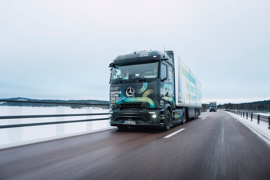 Mercedes-Benz Trucks, eActros 600‘ün iki üretime yakın prototipini bir kez daha Kuzey Avrupa’da bir test turuna gönderdi – ancak bu sefer soğuk mevsimde ve bazen çok zorlu kış koşullarında. “Avrupa Test Turu Kış 2025“in amacı, 2025 Yılının Uluslararası Kamyonu ödülüne layık görülen ve seri üretimde olan akü elektrikli eActros 600’ün pratikliğini, farklı rotalarda ve topografyalarda ve farklı iklim bölgelerinde Kuzey Avrupa’da temsili kış operasyonunda test etmek ve kış sıcaklıklarının ve yol koşullarının eActros 600‘ün enerji tüketimi üzerindeki etkisine dair önemli bilgiler edinmekti.