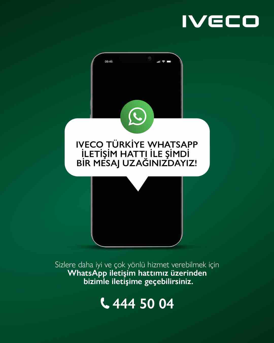Yaygın ve güvenilir hizmet ağına sahip IVECO markası, satış sonrası süreçleri ile ve devreye aldığı 444 50 04 numaralı çağrı merkezine ait WhatsApp İletişim hattı ile de müşterilerinin ve filo sahiplerinin her daim yanında olduğunu kanıtlıyor.