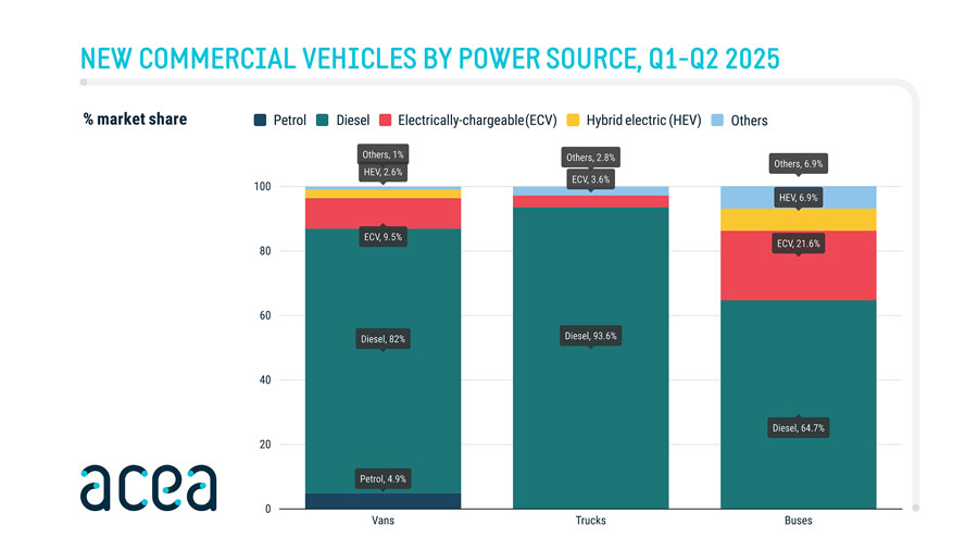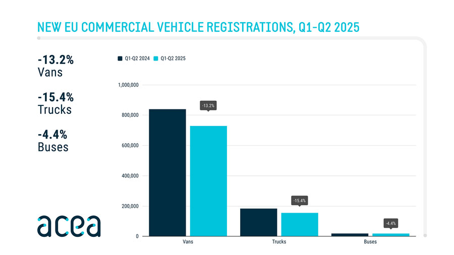 2025’in ilk yarısı, AB ticari araç pazarı için zorlu geçti ve halihazırda zorlu bir ekonomik ortamda, büyük pazarlarda önemli tescil düşüşleri yaşandı. Elektrikle çalışan araçların payı artmış olsa da, temel koşulların neredeyse yokluğu nedeniyle pazardaki büyümenin engellenmeye devam etmesi sonucunda büyüme eğilimi henüz yeterince hızlı değil.